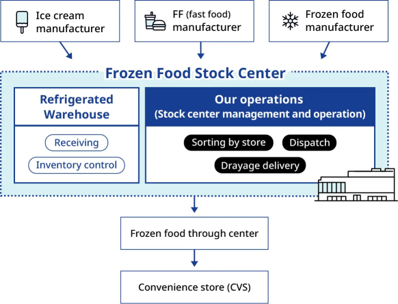We have a wide range of food-related experience, including center operations for major convenience stores and mass retailers, and delivery of drinking water and frozen foods. Especially for frozen products, we receive ice cream, frozen foods, and food sold in a hot display case next to the cash register from various manufacturers in our freezer warehouse, and sort and ship them based on shipping orders received from each convenience store every morning.
